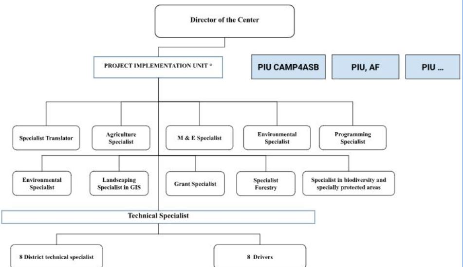 Проектное подразделение (Project Implementation Unit, PIU): специально создано для реализации проектов и зависит от наличия финансируемых донорских проектов. Оно спроектировано как гибкое и адаптивное, с возможностью масштабирования своей деятельности в зависимости от объема и требований финансируемых инициатив. Работа PIU носит проектный характер, что означает, что персонал, ресурсы и виды деятельности формируются в соответствии с конкретными проектами, получившими финансирование от доноров. Такой подход обеспечивает специализированное управление проектами, адаптированное к уникальным требованиям каждой инициативы.